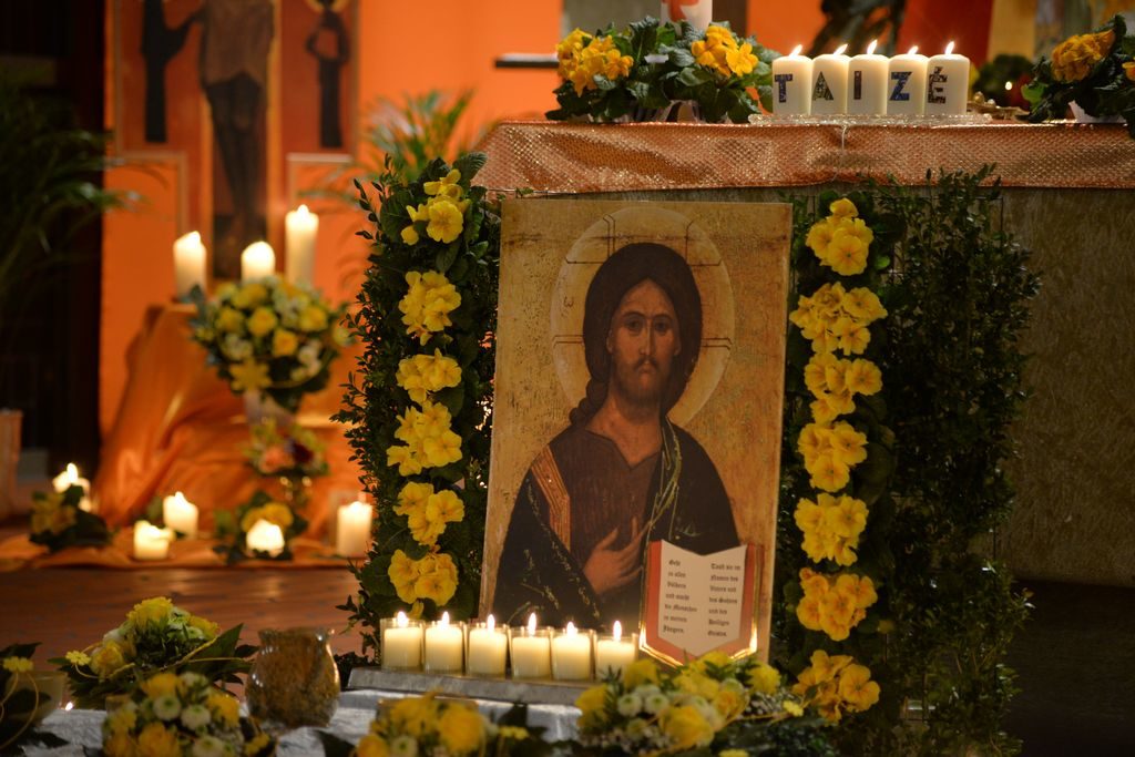Es war ein großartiges Jubiläum, das 20jährige Taizegebet in Rain. Die Kirche war sehr gut gefüllt, wunderschön geschmückt und die „der Geist von Taize“ wurde ökumenisch gefeiert. Dies verdeutlichten auch die kirchlichen Gäste: Weihbischof Dr. Josef Graf, Pfarrer Peter Häusler, das evangelische Pfarrer-Ehepaar Elke und Hasso von Winning, Pfarrer Ulrich Fritsch, Prädikant Max Heinzlmeir und Gemeindereferentin Monika Kirchbuchner-Dick. Ein besonderes Gepräge hatte die Segnung des Jordanwassers und die Erinnerung an die eigene Taufe: Jedes Mal, wenn wir uns mit Weihwasser bekreuzigen, erinnern wir uns an unsere eigene Taufe. Und bleiben in Beziehung mit Jesus, der von Johannes im Jordan getauft wurde. Gebete und Gesänge in verschiedenen Sprachen wechselten sich ab und zeigten damit auch die Solidarität mit den Christen in der ganzen Welt. Das Wort aus dem Matthäusevangelium „Darum geht zu allen Völkern und macht die Menschen zu meinen Jüngern; tauf sie auf den Namen des Vaters, des Sohnes und des Heiligen Geistes…“ war die Predigtgrundlage für Weihbischof Dr. Josef Graf. Am Ende des Jubiläumsgebetes überreichte Hauptorganisator Klaus Wagenpfeil an Weihbischof Dr. Josef Graf eine in Taize getöpferte Garnitur Kelch und Patene, sowie an Conny Arnold die das Musikteam nach 12 Jahren verlässt einen Blumenstrauß. Dass gemeinsam beten und gemeinsam feiern zusammengehört zeigte sich im Anschluss im Pfarrzentrum bei leckerer Kartoffelsuppe und Brot. Dankesworte an Klaus und Christa Wagenpfeil kamen dabei von Pfarrer Hasso von Winning für die Treue zum Taizegebet, seitens der Kirchenverwaltung Rain von Ludwig Feldmeier und durch „Taize-Freunde“ aus Rottenburg. Und nicht vergessen: das Taizegebt ist immer am letzten Freitag im Monat um 19 Uhr in der Kirche Zur Verklärung Christi in Rain – außer im März, da ist es wegen dem Karfreitag bereits am 23. März 2018.