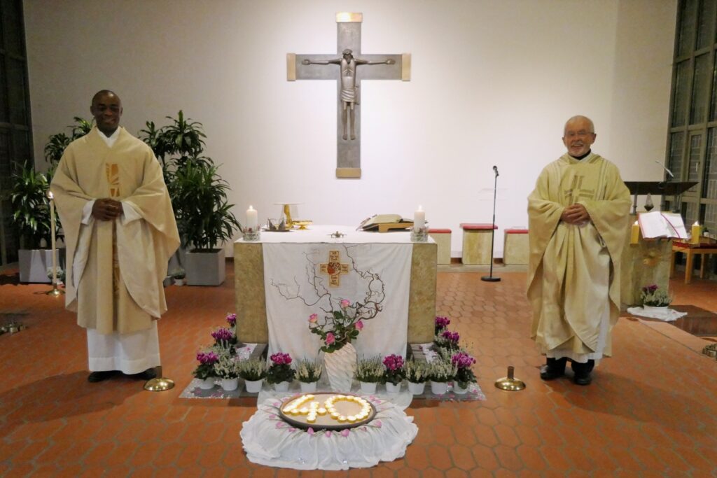 „Dankbarkeit erfüllt mich heute am allermeisten in diesem Raum“ sagte Pfarrer Hans Trimpl in der wunderschön geschmückten Kirche Rain „Zur Verklärung Christi Rain“ am Samstag, den 23. Oktober 2021. Er war zum Festgottesdienst gekommen, um mit seiner ehemaligen Gemeinde das 40jährige Kirchweihjubiläum zu feiern. In einer wegweisenden Predigt erinnerte er auch an das Motto des Weltmissionssonntags: „Lasst uns nicht müde werden, das Gute zu tun“. Herzliche Worte der Begrüßung hatte Pfarrvikar Innocent Ezewoko, der sich freute, dass dieses Jubiläum in der herrlich geschmückten Kirche gefeiert werden kann. „Im Namen unserer Gemeinde heiße ich dich herzlich willkommen bei uns“ sagte er zu Pfarrer Hans Trimpl und dankte ihm, dass er „den Bau dieser schönen Kirche begleitet hat“.  Pfarrvikar Innocent erinnerte, dass die Kirche ein Ort der Begegnung mit Gott und untereinander ist. Und hier lebe auch der Glaube in und mit uns. Begegnung gab es an diesem Abend auch mit Pfarrerin Christine Rießbeck und Pfarrvikar Innocent blickte auf die gute ökumenische Zusammenarbeit, die bereits Pfarrer Hans Trimpl vor 40 Jahren angestoßen und gut gepflegt hat.