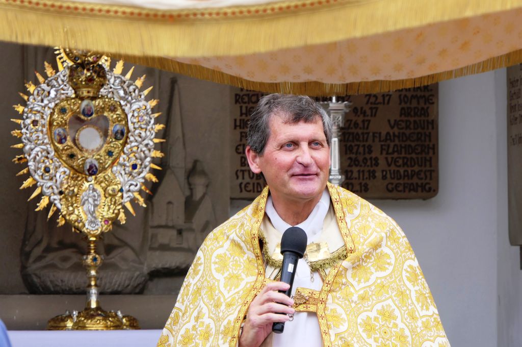 Pfarrer Peter Häusler hatte am Ende der Prozession am letzten Altar ein DANKESCHÖN an alle gesprochen, die das Fronleichnamsfest unterstützt und begleitet haben. Es war bei grandiosem Wetter ein wunderschönes und verbindendes Erlebnis! Es ist unmöglich, ALLE Dienste vollständig aufzuzählen, aber ich möchte zum Nachdenken anregen und zumindest auf einige Handgriffe hinweisen: es werden Birken im Wald geholt, die Straßen gekehrt, die Fahnen gehisst, die Häuser und Zäune geschmückt. Sänger und Sängerinnen sowie Instrumentalisten proben bereits im Vorfeld und sind dann am Festtag mit dabei. Es macht sich aber schon lange vorher auch jemand Gedanken was an so einem Festtag gesungen und gespielt werden soll. Viele Handgriffe rund um die Kirche sind von Mesner/Mesnerin, von Gärtner/ Gärtnerin und von der Putzfrau notwendig. Für den Blumenschmuck in der Kirche will gesorgt sein und das ist „nicht nur“ schnell mal hingestellt, sondern braucht Gedanken, nach dem was und wie und woher. Ebenso geht es auch den Familien beim Vorbereiten der Altäre: Tisch, Altardecken, Kreuz, Blumenschmuck, Kerzen, Teppich, Gebetsschemel usw. Die schönen Blumenteppiche machen sich auch nicht von alleine: nach der Motivwahl steht die Überlegung nach den passenden Blumen an. Wie dankbar ist man da, wenn man nach vorsichtiger Anfrage ein „Ja“ von einem Gartenbesitzer/Gartenbesitzerin bekommt für Blüten und Rasen. Kleine und große Hände sind nötig und willkommen zum Mähen, Pflücken, Schneiden und Legen. Dankbar dürfen wir auch sein für die Dienste des Vorbeters und des Lautsprecherträgers bei der Prozession, für die Dienste der Lektorinnen und unserer Ministranten/Ministrantinnen, egal ob beim Gottesdienst, unterwegs mit dem Kreuz voranmarschieren, die Kerzen an den Altären entzünden oder aufmerksam auf ihren Einsatz warten um beim richtigen Stichwort mit den Glöckchen zu läuten. Was wäre Fronleichnam ohne die Beteiligung unserer Vereine: auch da gibt es in jedem Verein Menschen, die zusätzlich zu ihrem eigenen Mitgehen andere zum Mitgehen einladen und informieren, die die Fahne holen, herrichten und tragen. Danke allen Frauen und Männern, die mitgehen, besonders den Müttern und Vätern, die ihre Kinder mitnehmen, ihnen Blumen oder Blumenkörbchen zum Streuen vorbereiten und so das Brauchtumsfest mit großer Tradition „mit-weiter-geben“. Es werden leider immer weniger!!! Nicht zuletzt ein Dankeschön an unseren Herrn Pfarrer Peter Häusler, der neben der gesamten liturgischen Gestaltung, der Gestaltung der Texte bei den Altären auch die körperliche Anstrengung des Monstranztragens zu leisten hatte.