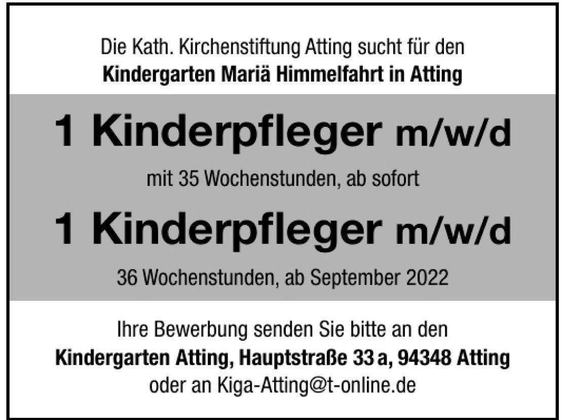 Kindergarten Atting sucht Kinderpfleger (m,w,d) für sofort und ab September 2022