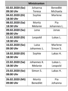 Unsere Ministranten werden auch im Februar wieder eifrig ihren Dienst am Altar leisten. Im Mini-Brief hat sich Pfarrer Peter Häusler dafür wie immer herzlich bedankt: „Wir stehen mitten in der Faschingszeit. Ich wünsche Euch für diese Tage viel Spass und Freude und dann natürlich auch eine erholsame Ferienwoche. Für Eure guten und treuen liturgischen Dienste sage ich Euch wieder ein herzliches Dankeschön!!! Vergelt´s Gott auch unserem Miniplan-Team Johanna und Sophie für die Erstellung des Planes und Frau Berndt für das Organisieren der Minis bei Beerdigungen, Proben etc.“ Hier können Sie die ganze Minipost für Februar lesen bzw. herunterladen: Ministrantenplan 02-2020