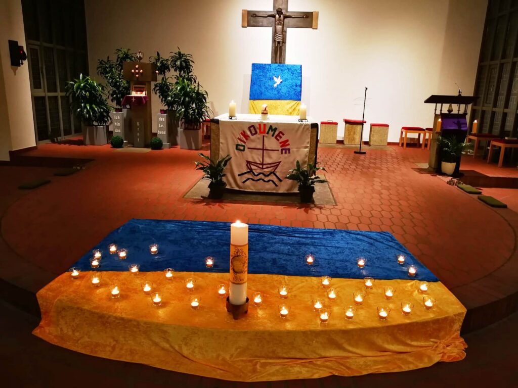 Am Sonntagabend hatte der Ökumenische Arbeitskreis aus Rain zum Ökumenischen Friedensgebet für die Ukraine geladen. Pfarrvikar Innocent Chinedu Ezewoko und Pfarrerin Christine Rießbeck zeigten sich von der Idee und von der Vorbereitung begeistert. So freuten sich alle, dass 65 Personen aus Rain, Atting und umliegenden Nachbargemeinden kamen und am Gebet teilnahmen. Federführend in der Vorbereitung waren Elisaebeth Pongratz und Cordula Brenner mit der Zusammenstellung und dem Vortragen der Texte,  sowie Klaus Wagenpfeil, der für die ansprechende Dekoration zeichnete. Gleich zu Beginn waren alle Teilnehmer eingeladen, ein Teelicht zum Altar zu stellen. Dabei wurde ein ukrainisches Jesuslied via Lautsprecheranlage gespielt. Das Gebet “zum Ankommen” stimmte in die Situation der Ukraine ein und die Fassungslosigkeit und Hilflosigkeit wurden gemeinsam mit der Angst vor Gott gebracht. Abwechselnd beteten Pfarrvikar Innocent und Pfarrerin Rießbeck oder gaben kurze Impulse zum Nachdenken. Psalmen, Lieder und Hymnen wechselten sich ab. Die Seligpreisungen aus dem Matthäus-Evangelium “für uns hier und heute” wurden vorgetragen und anschließend mit dem Lied “Selig seid ihr” noch eindrücklicher gefestigt. Kyrie-Rufe aus der Ukraine waren ebenso Teil der ökumenischen Gebetsstunde wie das gemeinsame Vater unser. Der aaronitische Segen von Pfarrvikar innocent und Pfarrerin Rießbeck sollte “Mut zum Glauben, zum Hoffen und zum Lieben” geben. Das Gebet beendeten die Schlawiner mit einem ergreifenden “Dona nobis pacem”. Die Kirchenbesucher spendeten 635,00 Euro für Flüchtlinge aus der Ukraine. Vier Frauen haben in Rain im Hundeclub vorübergehend eine Notunterkunft gefunden und fleißge Helfer haben in einer “Blitzaktion” – wie es Elisabeth Pongratz nennt – für Wohnlichkeit gesorgt. Den vier Flüchtlingsfrauen überreichten Elisabeth Pongratz und Klaus Wagenpfeil den Spendenbetrag.