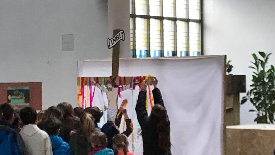 Als Zeichen der Vorfreude auf die Auferstehung Jesu schmückten die Kinder und Jugendlichen das Kreuz mit bunten Bändern. (Text/Fotos: Pfarrer Peter Häusler)