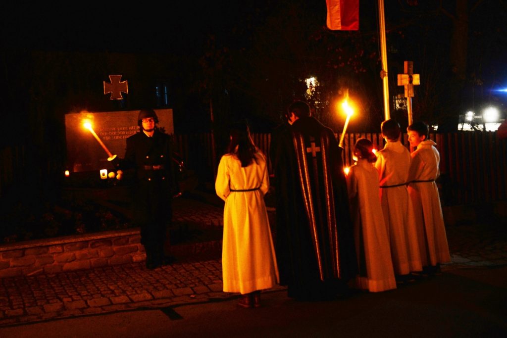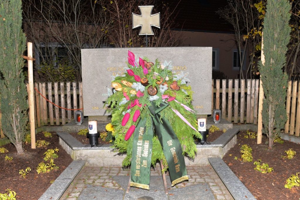 Nach dem Gottesdienst versammelten sich Pfarrer Peter Häusler mit den Ministranten, Bürgermeisterin Anita Bogner und Vertreter der Gemeinde, Vereine und Patenkompanie am Kriegerdenkmal zum Gebet. Eine Abstellung bildeten zwei Soldaten der Patenkompanie mit ihren Fackeln. Als Vorsitzender der KRuSK Rain sprach Paul Hornauer im Gedenken an die Vermissten und Gefallenen. Er plädierte dafür, im vereinten und zusammenwachsenden Europa den Frieden nicht zu vergessen. Eindringlich mahnte er: „Der Friede ist unser höchstes Gut. Es darf bei uns keinen Krieg mehr geben“.